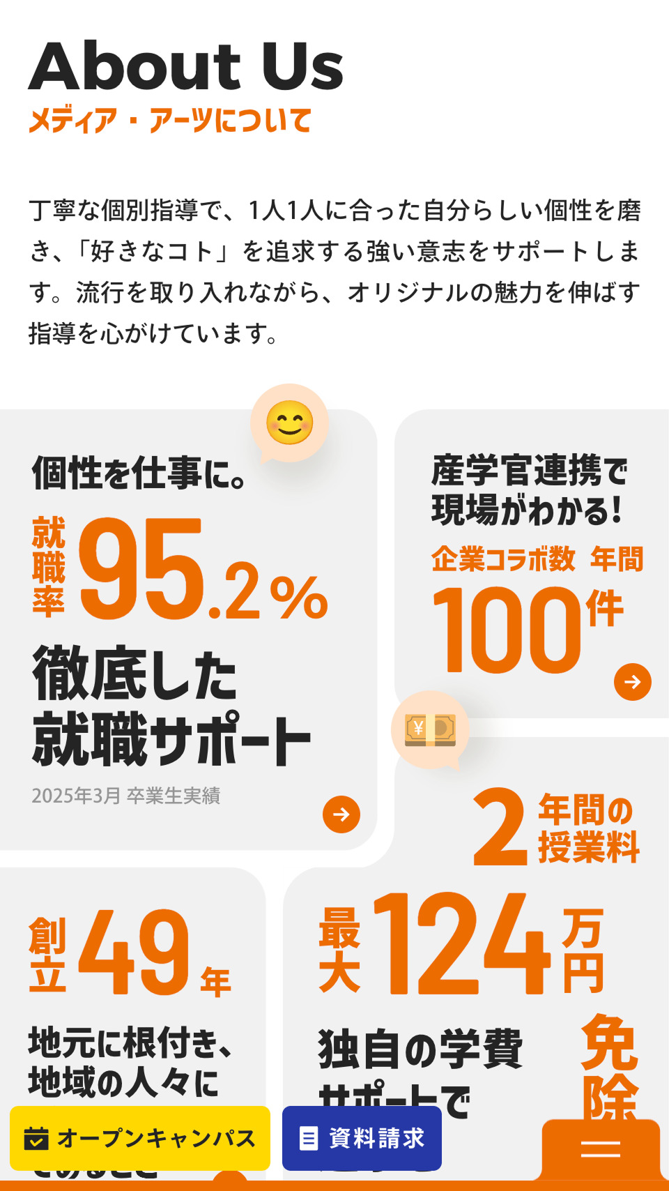 Webサイトでは、学生の皆様の活き活きとした表情・動き、授業に取り組む姿で学校の雰囲気を伝えるだけでなく、高校生向け、保護者向け、社会人や留学生の方、学生採用を検討されている企業の方など、Webサイトに訪問された方別にご案内する導線を設置し、豊富なコンテンツの中から知りたい情報に辿り着けるような設計をしております。