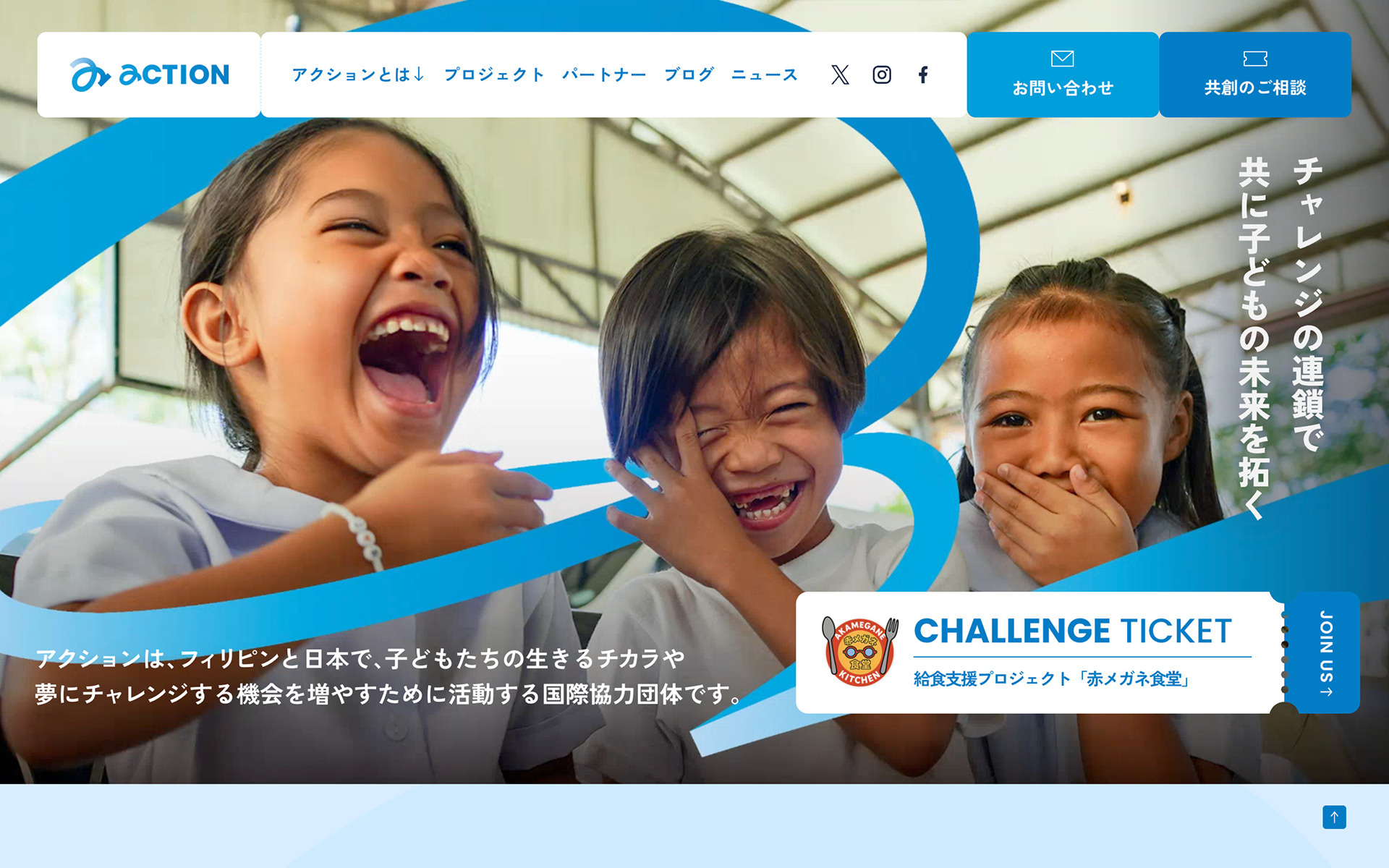 フィリピンと日本で、教育や社会制度づくりを通して、子どもたちの生きるチカラや夢にチャレンジする機会を増やすために活動する国際協力団体であるNPO法人アクション様のWebサイトです。