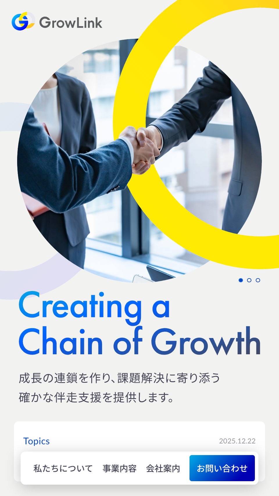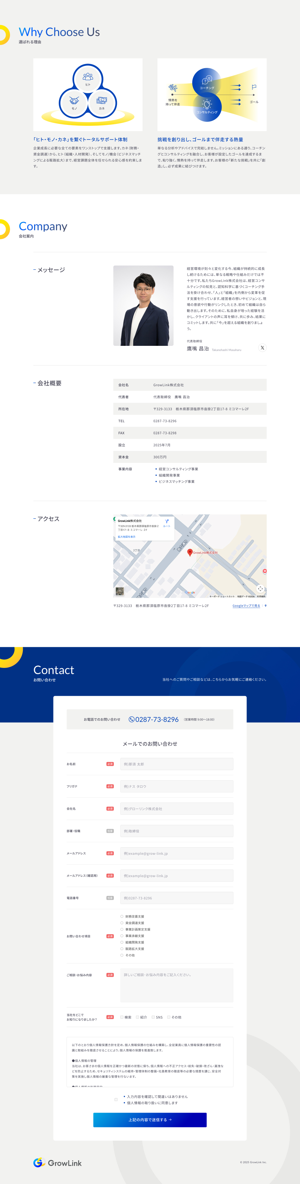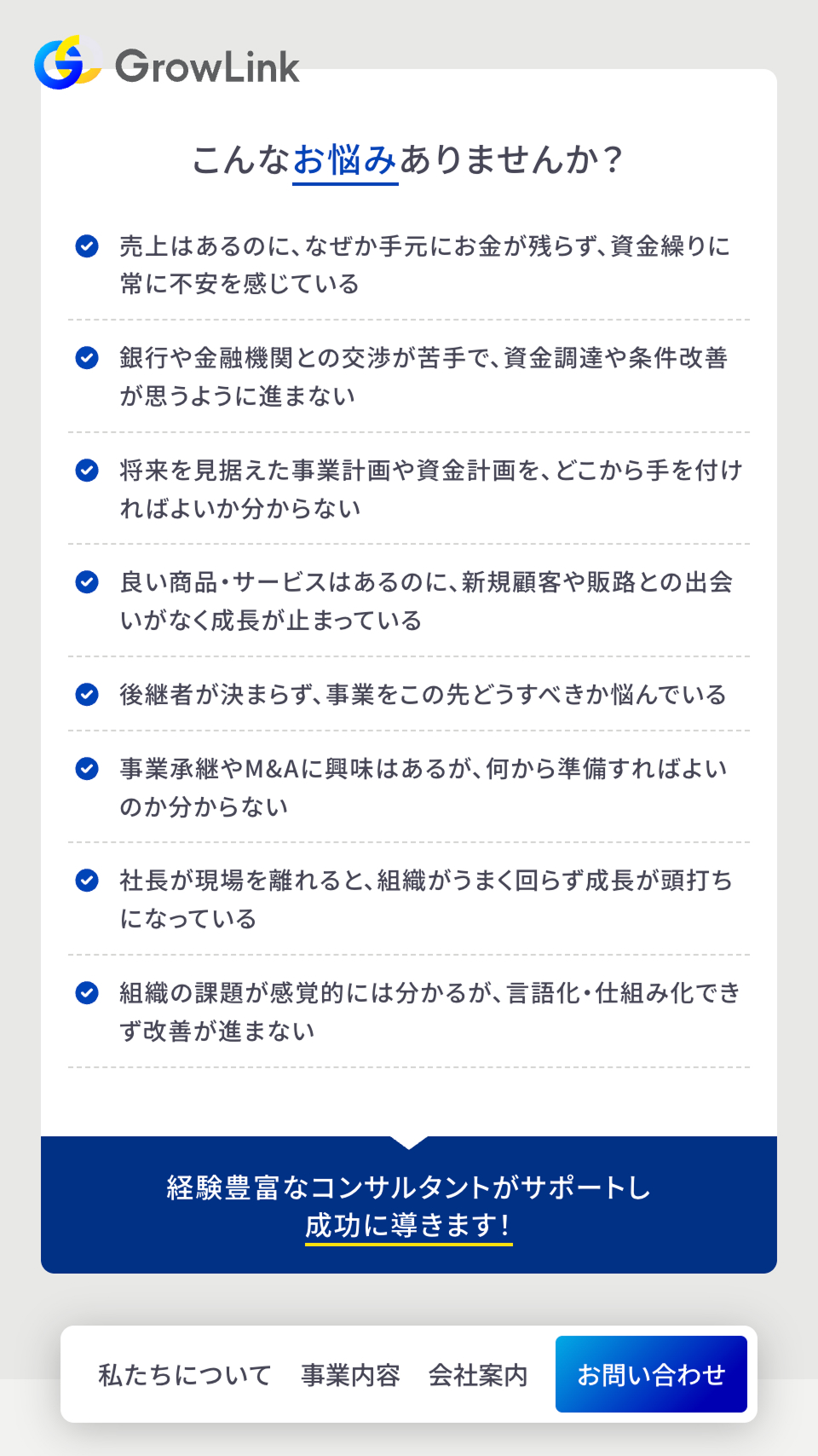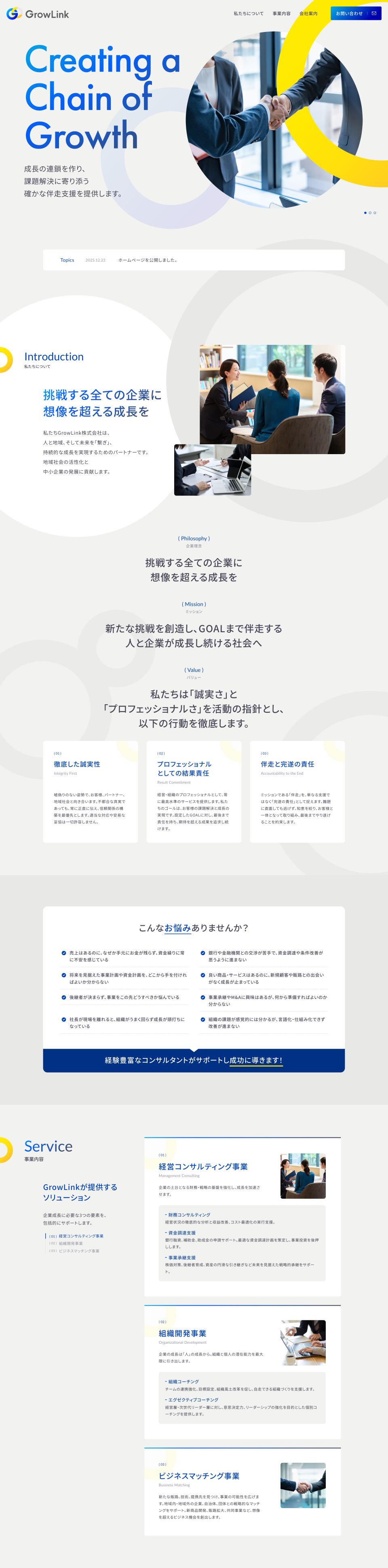 事業承継支援や組織開発、経営改善などのコンサルタント事業を展開するGrowLink株式会社様のコーポレートサイトを制作いたしました。