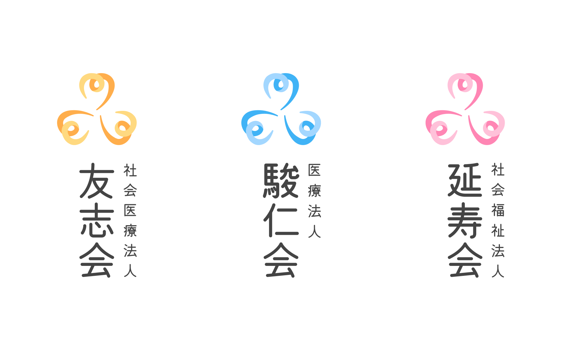 あわせて、グループに属する「社会医療法人友志会」「社会福祉法人延寿会」「医療法人駿仁会」の3法人のロゴも、統一したイメージのもとで制作しています。