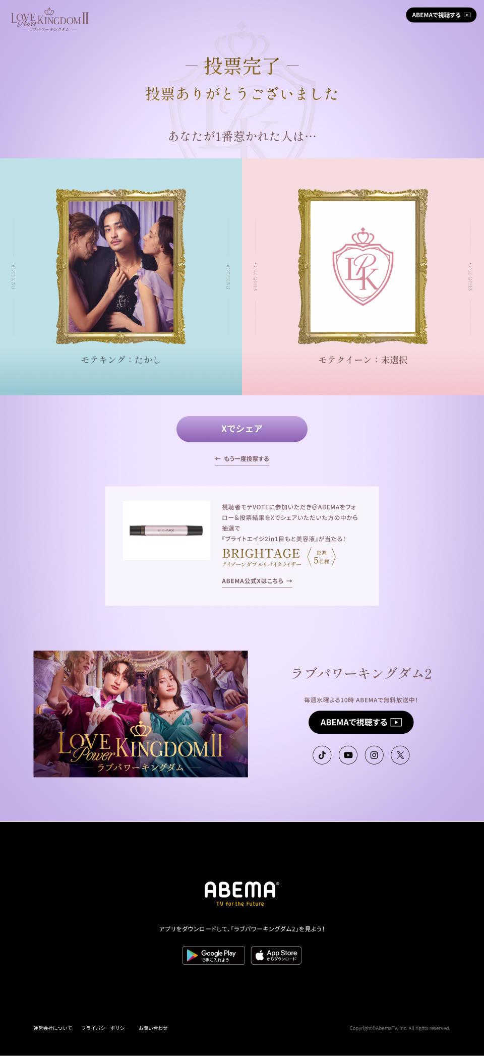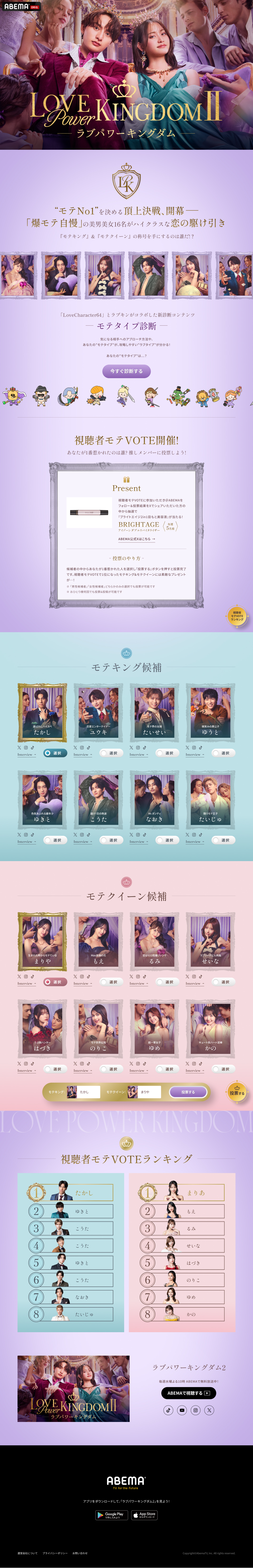 ABEMAにて2026年2月放送 「ラブパワーキングダム2」 の予想投票サイトを制作いたしました。